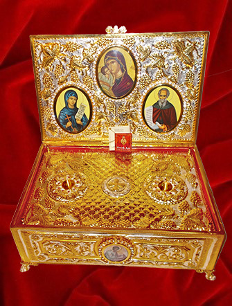 Această raclă de tip cufăr este o operă de artă sacră, realizată cu o atenție meticuloasă la detalii și placată integral cu aur și argint. Designul său complex îmbină iconografia pictată cu reliefuri metalice bogate, fiind un obiect central de pelerinaj pentru orice lăcaș de cult.