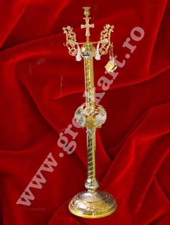 Realizat cu o atenție remarcabilă la detalii sub marca Greek Art, suportul se distinge prin coloana sa zveltă și prin elementele heraldice lucrate în relief, fiind un accesoriu de lux pentru orice altar sau catedrală.
